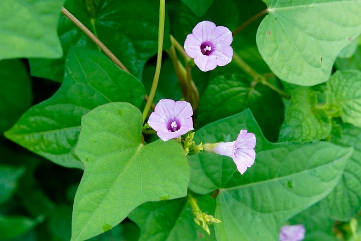 This is a species of Ipomoea morning glory known by several common names, including Littlebell and Aiea morning glory. It’s a fast-growing, vining, annual herb producing long, thin stems with ivy-like, petioled, heart-shaped leaves 2.5–6 centimetres (0.98–2.36 in) long. The leaves sometimes, but not always, have three lobes. The vines produce tubular bell-shaped flowers, each about two centimeters long. They are (quite) variable in color, in shades of pink, red or lavender, with or without white marking.